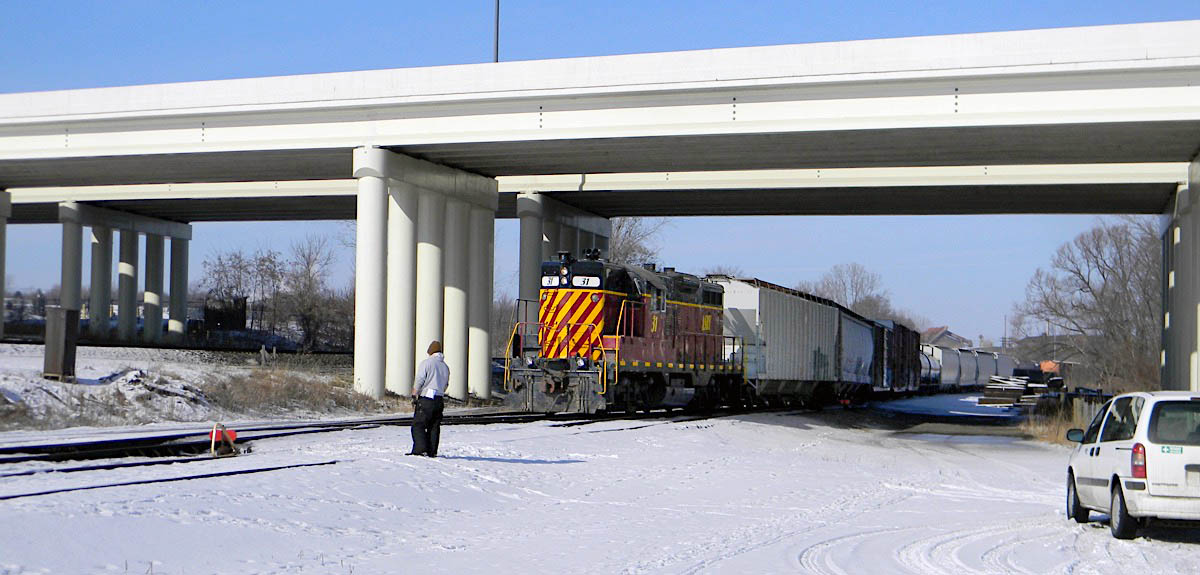 After a great afternoon of chasing the West Salem local from Mansfield through Ashland, and then waiting for more than an hour for the crew to finish up at the industrial park hidden on the other end of town, my railfan compatriots and I assumed the better part of our day was over. Word on the street was that the Ashland hardly ever switched the east end of town anymore, so we were ready to hop in the van and ride east as the job left town. But when #31 rolled through the downtown area with loads coupled to both ends, we immediately knew something great was in store. Sure enough, it was not long before the ex Pennsy Geep slid her way down the steep incline, two tankers in tow. It was obvious to us that she had not made this adventuresome trek in some time, because snow completely covered the rails beyond the road crossing. There was enough snow, in fact, that on the first road crossing the old Geep plowed to a premature halt — the engineer had to back up and take another run down the lead in order to clear the switch. That effort successful, #31 and her friendly crew disappeared for a spell as the tankers were spotted down at the far end of this fascinating lower line. Soon she returned light, crossed the street again, then slowly rocked her way back up the incline to pick up her West Salem loads for a twilight trek east. Switchback B-B action in the snow: A good day railfanning on the old Erie.